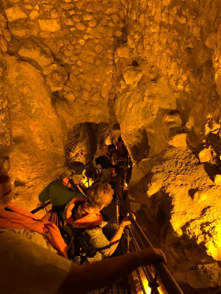 Tout en bas le groupe se sépare en deux : certains rejoindront le bassin de Siloé en marchant dans l’eau dans un long et étroit tunnel, et les autres par un tunnel à pied sec également très étroit.